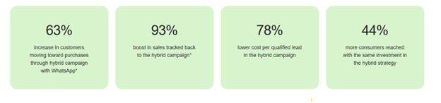 حقق الحملة عائدًا على الاستثمار عشرة أضعاف المبلغ المنفق، مع مبيعات تصل إلى 500,000 دولار تم ربطها عبر واتساب. كما حققت هذه الرسائل معدل نقر بلغ 57%.