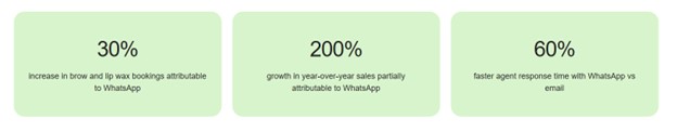 (Benefit Cosmetics)  بتحسين خدمة العملاء باستخدام منصة واتساب للأعمال لإدارة المواعيد وزيادة التفاعل مع العملاء. في السابق، كان على العملاء الاتصال بالمتجر لتعديل مواعيدهم. لكن عبر واتساب، أصبح بإمكانهم الآن تعديل الحجز والوصول إلى المعلومات عبر روبوت المحادثة.